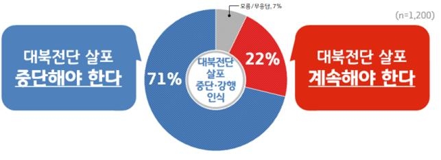 우선 응답자의 71%는 ‘대북전단 살포를 중단해야 한다’고 답했다. ‘대북전단 살포를 계속해야 한다’는 응답은 22%로 나타났다.