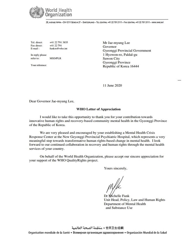 28일 경기도에 따르면 세계보건기구 정책, 법 그리고 인권 분과 총책임자인 미셀펑크 박사는 6월 11일자로 보낸 감사장을 통해 “새로운 경기도립정신병원의 정신건강위기대응센터는 정신보건 분야를 인권기반으로 획기적으로 변화시킨 의미 있는 첫 걸음”이라고 평가한 후 “(정신질환자의) 회복과 인권을 향한 국제적 협력이 미래에도 이어지길 기대한다”고 전했다.
