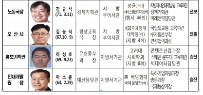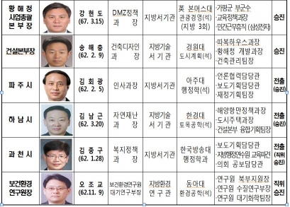 3급 국장급은 홍보기획관에 이성호 문화종무과장, 인재개발원장에 이소춘 예산담당관, 황해경제자유구역청 사업총괄본부장에 강현도 DMZ정책과장, 건설본부장에 송해충 건축디자인과장을 승진 임명했다.