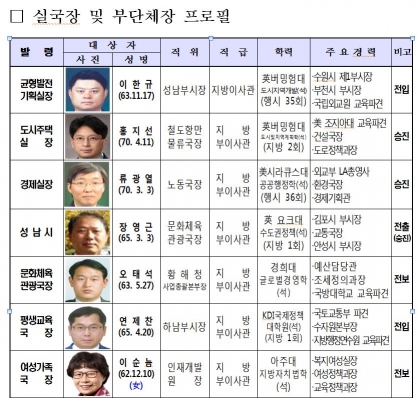 2급 실장급으로는 기술직 도시주택실장에 홍지선 철도항만물류국장, 북부청 균형발전기획실장과 경제실장에 각각 이한규 성남부시장과 류광열 노동국장을 임명했다. 2급 부단체장 직위인 성남부시장에는 장영근 문화체육관광국장이 자리를 옮긴다.