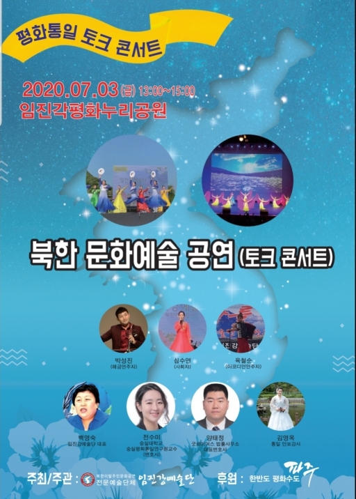 이날 토크콘서트에는 김영옥 통일 안보강사의 사회로 백영숙 임진강예술단 대표, 전수미 숭실대학교 숭실평화통일연구원 교수, 양태정 굿로이어스 법률사무소 대표변호사, 김영옥 통일 안보강사 등 평화통일 관련 분야의 인사들이 참여해 심도 깊은 이야기를 나눈다. 또한 평화통일 토크와 더불어 ▲해금연주(박성진) ▲아코디언 연주(육철순) ▲북한노래와 춤(임진강예술단) 등의 북한 문화예술 공연도 마련돼 있다.