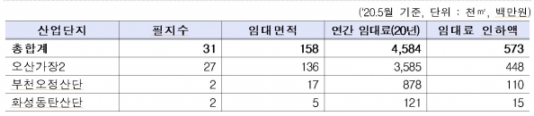 ○ 오산가장2 등 3개 임대산단(31필지, 총 158천㎡) 적용‥총 감면 임대료 5억7,000만원 추산