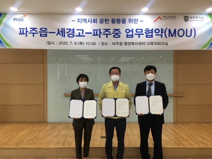 파주시 파주읍은 지난 9일 세경고등학교, 파주중학교와 지역사회 공헌을 위한 교육자원 활용 등 공동협력을 위한 업무협약을 체결했다.