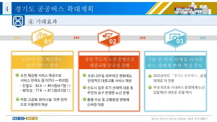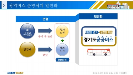 무엇보다 공공주도의 노선계획을 통해 급행노선 운행, 초기 신도시 지역에 선제적 노선 투입 등 도민 요구를 반영한 노선운영에 초점을 둘 방침이다.