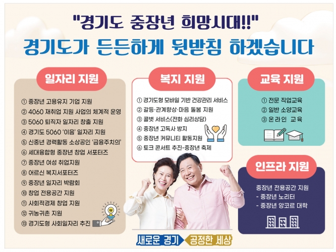 경기도가 중장년 일자리지원센터를 설치해 중장년 전담 일자리 지원 기능을 강화하고 경기도형 사회 일자리 확대로 3,600여개의 일자리를 만든다. 중장년층이 겪는 갈등과 우울, 관계완화를 위한 마음돌봄 지원 등 50·60대를 위한 다양한 복지정책도 강화한다.