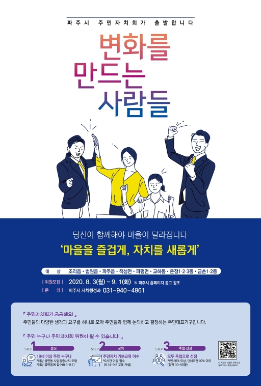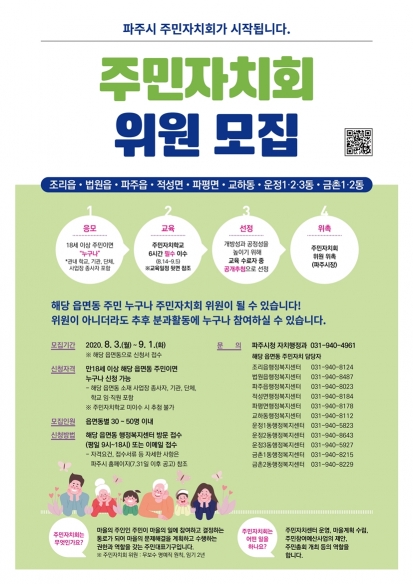 주민자치회와 관련한 자세한 문의는 파주시청 자치행정과(☎031-940-4961)로 하면 된다.