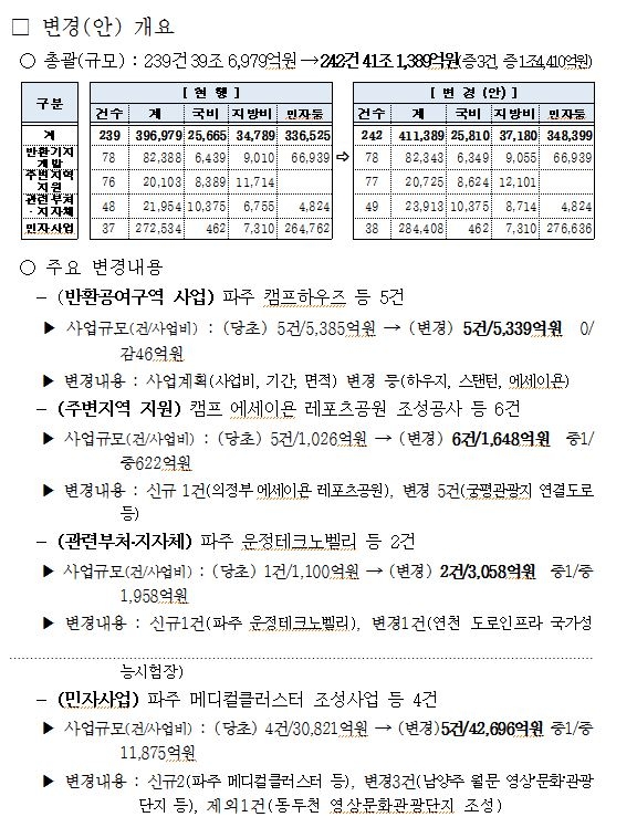 ‘관련부처·지자체사업 및 민자사업’의 경우, 1조5,000억 원이 투입되는 파주 메디컬클러스터, 1조1,071억 원 규모의 연천 무비월드 테마파크, 2,058억여 원 규모의 파주 운정테크노밸리 등 대규모 지자체 및 민자사업 등이 새로 포함됐다.