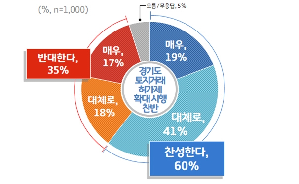경기도가 지난 13~14일 18세 이상 도민 1,000명을 대상으로 한 여론조사 결과에 따르면 응답자의 60%는 도가 검토 중인 실거주 목적 외 투기용 부동산거래를 규제하는 ‘토지거래허가제’ 확대 시행에 ‘찬성’한다고 답했다. ‘반대’는 35%였다.