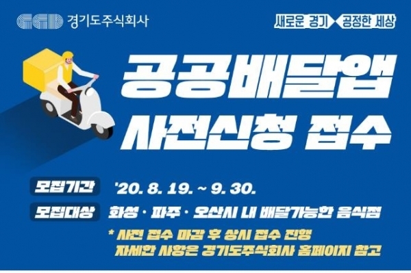 가입서류는 사업자등록증, 통장사본이며, 신청접수를 완료한 가맹점부터 경기도 주식회사가 직접 방문해 POS기기 연계, 메뉴등록 등 서비스 환경을 구축해준다. 특히 오는 9월 30일까지 사전신청 접수기간에 신청한 가맹점의 경우 오는 10월 시범 서비스를 선보일 공공배달앱에 우선 입점할 수 있다.