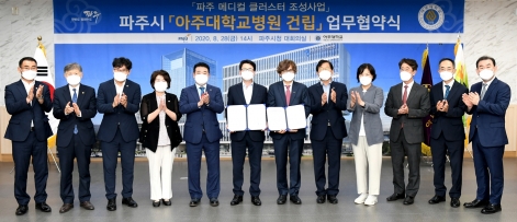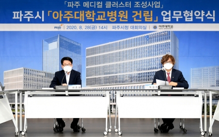 파주시에 아주대병원이 들어선다. 파주시는 28일 아주대학교와 파주시청 대회의실에서 ‘아주대학교병원 건립을 위한 업무협약’을 체결하고 시민들의 간절한 염원이었던 대학병원을 건립하기로 최종 합의했다.