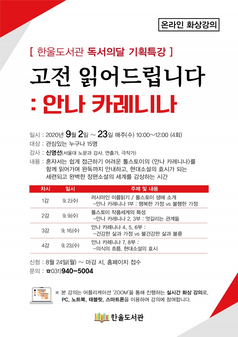 <고전 읽어드립니다: 안나 카레니나> 강의 신청이나 자세한 내용은 파주시 한울도서관 홈페이지 (https://lib.paju.go.kr/hulib) 또는 전화(☎031-940-5004)로 문의하면 된다.