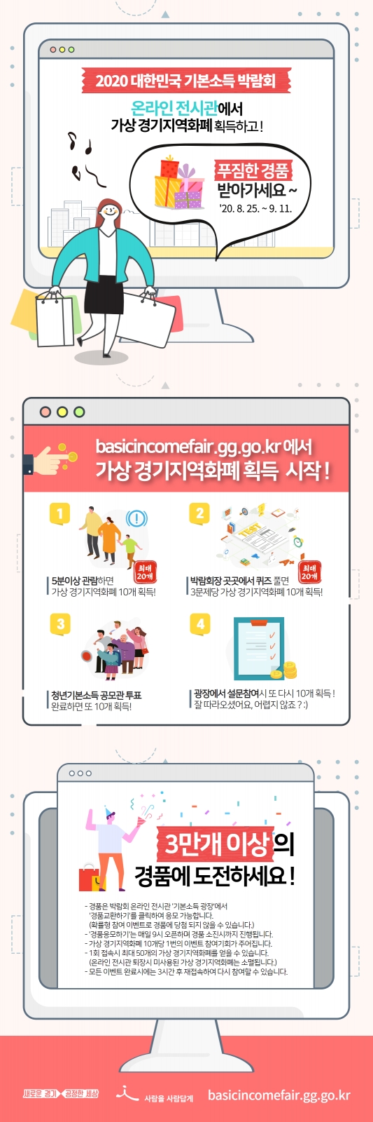 참여형 프로그램으로는 ‘가상 경기지역화폐 이벤트’가 진행 중이다. 온라인 전시장을 찾아 일정시간 이상 콘텐츠를 감상하거나 ‘기본소득 퀴즈 풀기’, ‘박람회 설문 참여’ 등에 참여하는 관람객에게 추첨을 통해 다양한 경품을 지급한다.