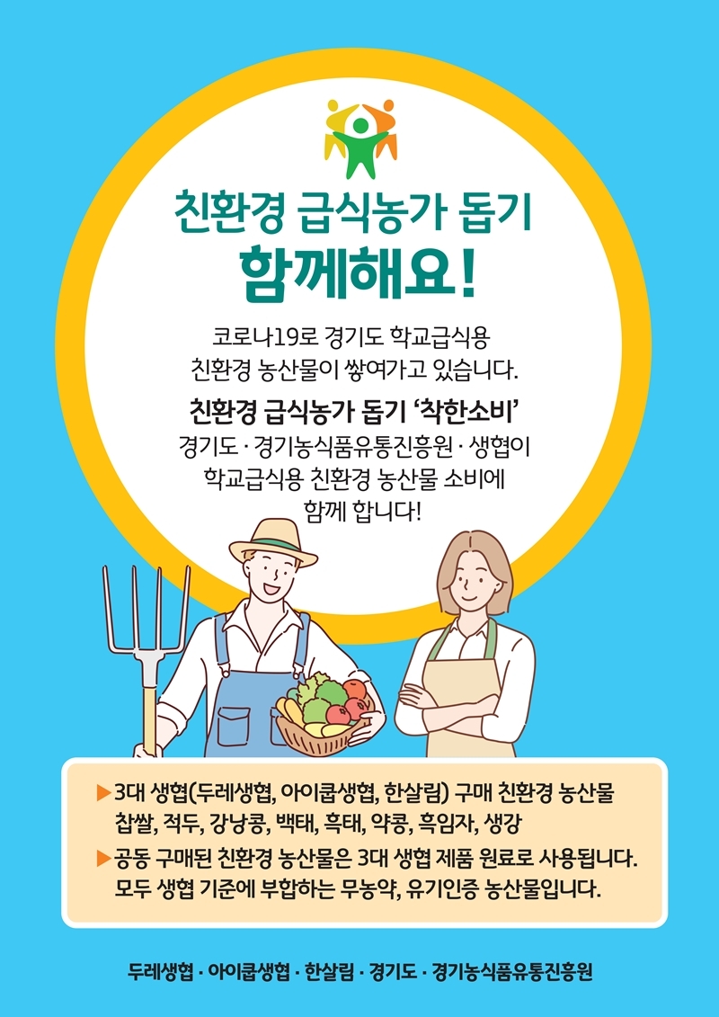경기도와 경기농식품유통진흥원(유통진흥원)이 우리나라 대표적 생활협동조합인 두레생협, 아이쿱생협, 한살림과 손을 잡고 도내 학교급식용 친환경 수매 농산물을 공동 판매한다.