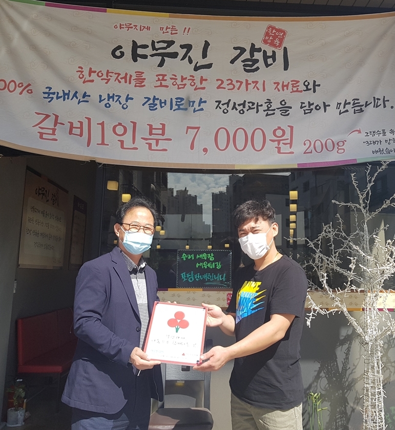 이종민 야무진갈비 대표와 목유경 성원닭갈비 대표는 ”항상 이웃과 나누며 서로 돕고 살아야 한다는 마음을 품고 있었는데 지역사회보장협의체위원의 권유로 착한가게에 가입하게 됐다“라며 ”비록 큰돈은 아니지만, 어렵고 힘든 사람들에서 도움이 됐으면 한다“라고 말했다.