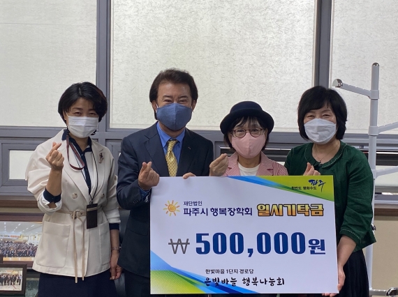 파주시 운정3동 마을공동체로 한빛마을1단지 경로당에서 활동 중인 ‘한빛마을1단지 은빛바늘 행복나눔회(대표 염미준)’, ‘37도 마음학교(대표 홍연희)’는 바느질을 통해 얻은 수익금 50만원을 장학금으로 전달했다.