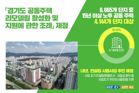 도는 도민의 70%(430만 세대중 300만세대) 이상이 거주하는 공동주택의 노후화 가속에 대한 대책 필요성을 인식하고 이재명 경기도지사 공약에 따라 전문가 자문․관련 기관 협의․주민 의견청취 등 준비과정을 거쳐 이번 조례를 마련했다.