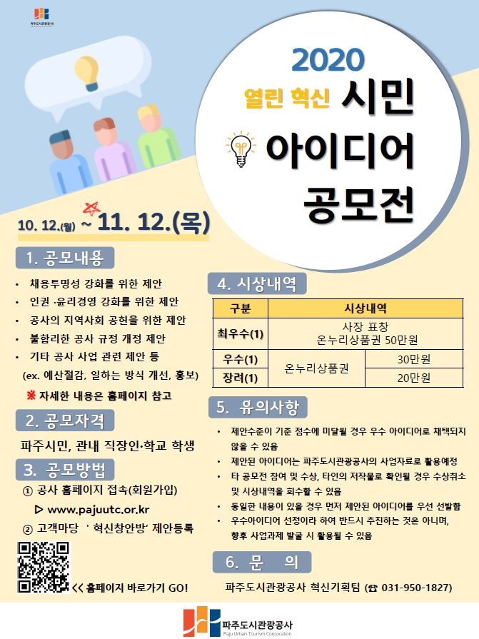 ○ 파주도시관광공사(사장 손혁재, 이하 공사)는 지난 10월 12일에 개최한 ‘2020 열린 혁신 시민 아이디어 공모전’을 11월 12일까지 연장하여 실시한다고 밝혔다.