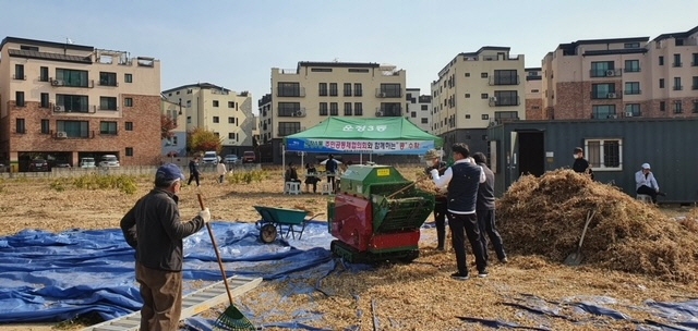 이날 주민공동체협의회 회원들이 함께 비료주기, 제초작업 등 정성을 들여 키운 콩 200kg을 수확했으며 수익금은 운정3동 마을을 위해 쓰일 예정이다.