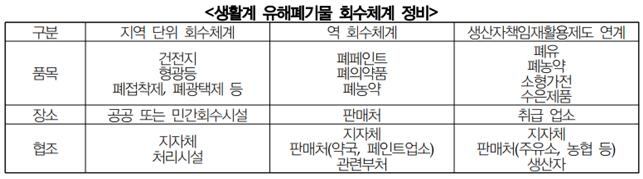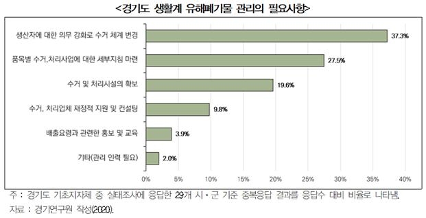 생활계 유해폐기물 회수를 위한 거주지 지정 배출 및 지역 거버넌스 구축도 필요한 것으로 분석됐다. 지역의 유해성 저감 및 관리를 위해 생활계 유해폐기물 특수 수거함을 마련하고 회수장소를 지정하며, 인센티브 제공 등 시범사업을 운영하여 그 결과를 토대로 경기도 전역에 확대 적용하자는 내용이다.