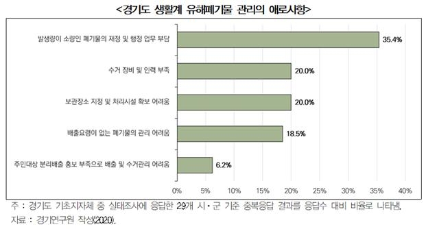 지난 6월 1일부터 23일까지 경기도 31개 시군 공무원을 대상으로 한 ‘경기도 생활계 유해폐기물 관리실태 관련 설문조사’에 따르면 소량 폐기물에 대한 가장 큰 애로사항으로 재정 및 행정업무 부담을 꼽았고, 다음으로는 수거 장비 및 인력 부족, 보관장소 지정 및 처리시설 확보의 어려움, 배출요령이 없는 폐기물의 관리 어려움, 주민 대상 분리배출 홍보 부족으로 배출 및 수거관리 어려움 순으로 응답했다.