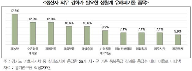 생산자 의무 강화 제품으로는 폐농약을 가장 높게 꼽았으며, 다음으로는 수은 함유 폐기물과 폐페인트, 폐의약품과 폐살충제를 선택했다.