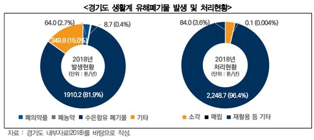 경기도 생활계 유해폐기물은 2018년 기준 연간 2,332.7톤이 발생했으며, 이는 2017년 3,423.7톤 발생 대비 31.9% 감소한 수치다.