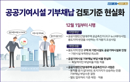 개정의 주요 내용은 ▲서로 다른 성격의 사업 분리 ▲공공기여 기부채납 대상 및 부담량 현실화 ▲공공기여시설 기부채납 부담기준 산식의 공정화 등이다.