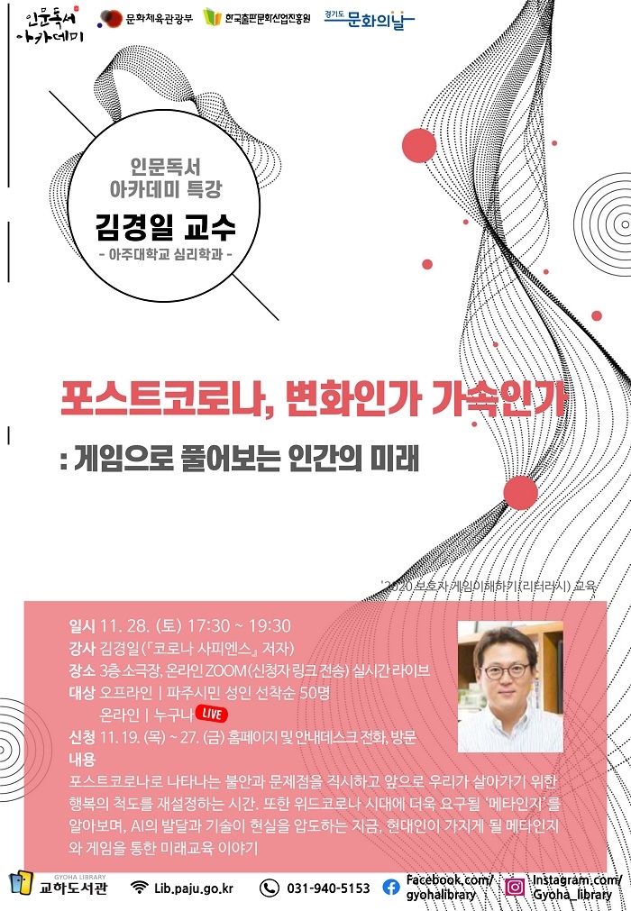 파주시 교하도서관이 오는 28일 소극장에서 <코로나 사피엔스>의 공저자이자 아주대학교 심리학과 교수인 김경일 교수를 초빙해 강연을 진행한다.