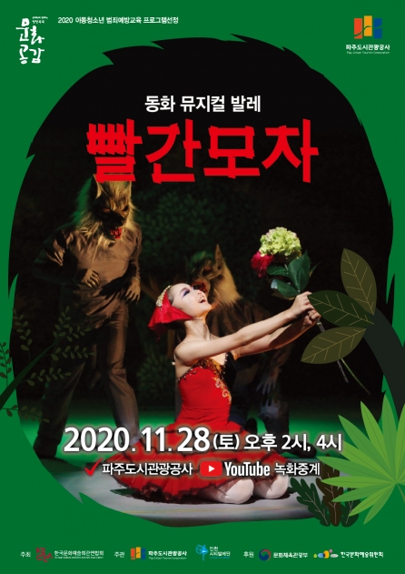 한국문화예술회관연합회 방방곡곡문화공감 사업으로 진행되는‘뮤지컬발레 빨간모자’는 28일(토) 오후2시, 4시에 파주도시관광공사 유튜브에서 방송된다.