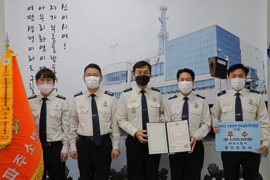 파주소방서(서장 김인겸)는 지난 10월 경기도 35개 소방관서를 대상으로 실시한 '2020년 소방장비 관리실태 확인점검' 평가에서 A그룹 '우수' 소방관서로 선정됐다고 1일 밝혔다.