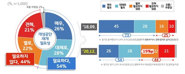 경기도는 지난 5일 도민 1,000명을 대상으로 개성공단 재개에 대한 여론조사를 실시한 결과, 개성공단 재개 필요성에 공감하는 비율이 54%로 나타났다고 20일 밝혔다. ‘필요하지 않다’는 입장은 44%였다.