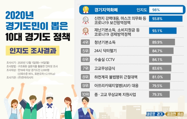 경기도민이 올해 경기도가 추진한 정책 가운데 가장 잘 알고 있는 것은 경기지역화폐이며, 가장 많은 지지를 보인 정책은 역학조사관·선별검사소 확대 등 코로나19 시설방역 조치라는 조사결과가 나왔다.