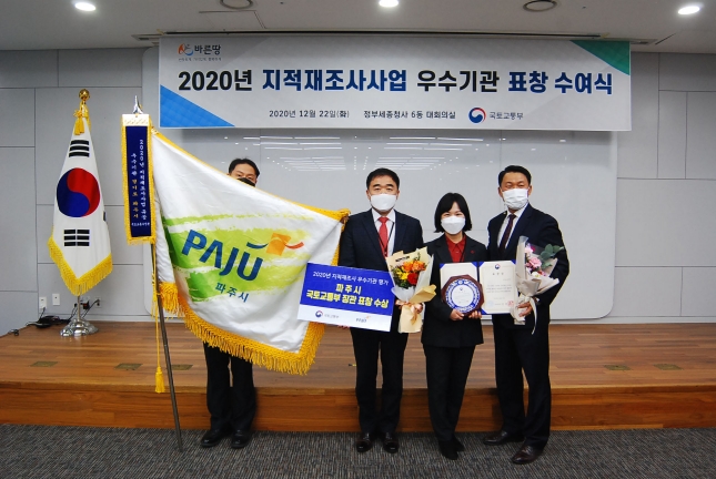 파주시가 국토교통부 주관 ‘2020년도 지적재조사사업 평가’에서 우수기관으로 선정돼 국토교통부장관 표창을 받았다. 표창 수여식은 지난 22일 오전 10시 정부세종청사 대회의실에서 간소하게 진행됐다.
