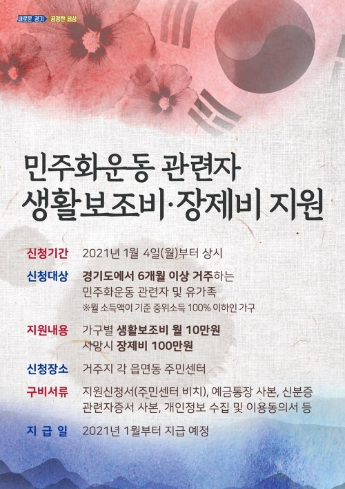 경기도가 1월부터 경기도에 거주하는 민주화운동 관련자와 유족에 월 10만 원의 생활지원금과 100만 원의 장제비를 지원하기로 한 가운데 4일부터 거주지 읍면동 주민센터에서 지원 신청을 받는다.
