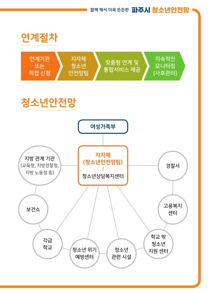 파주시는 이런 위기청소년들을 위해 지역사회가 관계부처와 민간을 연계할 수 있도록 지원하는 여성가족부의 ‘청소년안전망팀’ 선도사업 취지에 공감했다. 이에 동참하고자 공모에 신청했고, 사업에 선정된 후 전담공무원 3명과 사례관리사 3명을 배치한 전담팀을 꾸렸다. 특히 사례관리사는 청소년지도사, 청소년상담사, 사회복지사 등 전문 자격증을 소지하고 관련 경력 2년 이상의 청소년전문가로 구성했다.