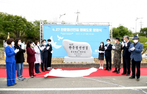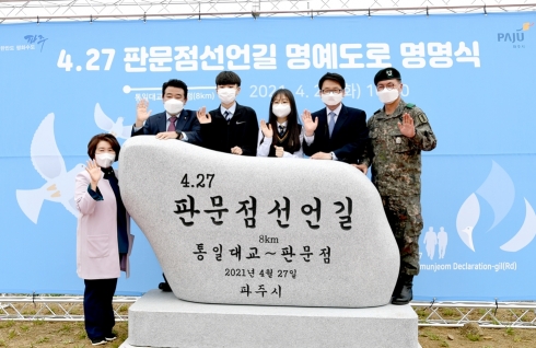 파주시는 27일, 4.27 판문점선언 3주년을 기념해 판문점 인근 민통선 지역 내 국도1호선 군내삼거리에서 ‘4.27 판문점선언길 명예도로 명명식’을 열었다.