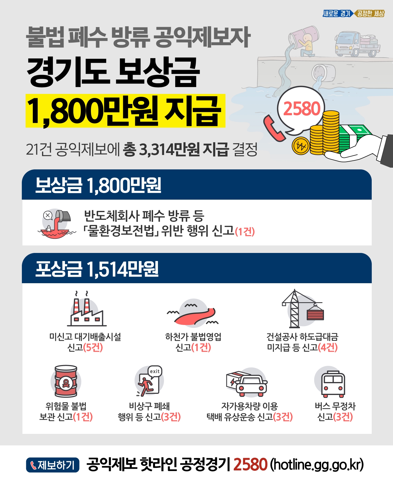 경기도, 불법 폐수 방류 공익제보자에게 보상금 1,800만원 지급