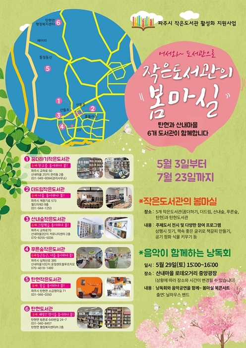 파주시 탄현도서관은 5월 3일부터 7월 23일까지 작은도서관 활성화 지원의 일환으로 5개소의 작은도서관과 협력해 ‘작은도서관의 봄마실’을 운영한다.