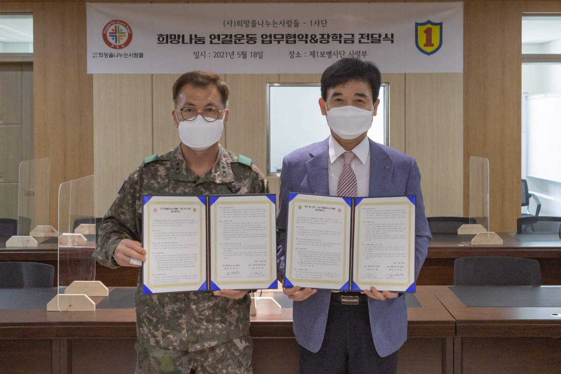 육군 1사단은 국민들의 안보의식 고취 및 장병들의 사기를 진작하고 민·군 유대를 강화하기 위해 사단법인 ‘희망을나누는사람들(이하 희망사)’과 지난 18일 사단 사령부에서 업무협약(MOU)을 체결했다.