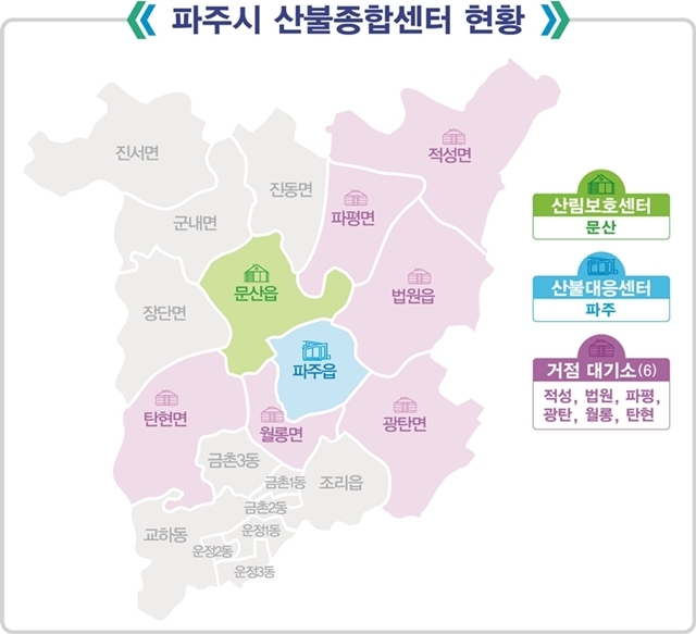 때문에 기존의 문산읍 산림보호센터 이외에도 파주시 봉암리에 ‘산불대응센터’를 설립, 권역별로 분리해 산불을 관리하기 시작했다.