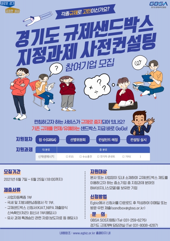 규제샌드박스 컨설팅 희망 기업은 경기도 규제개혁담당관실(031-8008-4287) 또는 경기도경제과학진흥원(031-259-6276)으로 문의하면 된다. 신청은 이지비즈(www.egbiz.or.kr)를 통해 할 수 있다.