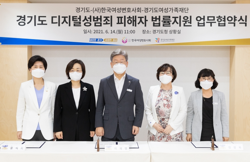 이재명 경기도지사와 윤석희 (사)한국여성변호사회 회장, 정정옥 경기도여성가족재단 대표이사는 14일 경기도청에서 이런 내용을 담은 경기도 디지털성범죄 피해자 법률지원을 위한 업무협약을 체결했다. 협약식에는 백혜련 국회의원도 참석했다.