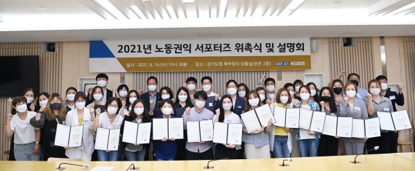 경기도가 16일 경기도청 북부청사에서 올해 편의점 등 소규모 사업장 종사 단시간·취약노동자의 권익 향상과 노동인권 사각지대 해소를 위해 활동할 ‘경기도 노동권익 서포터즈’를 대상으로 위촉장 수여식을 진행했다.