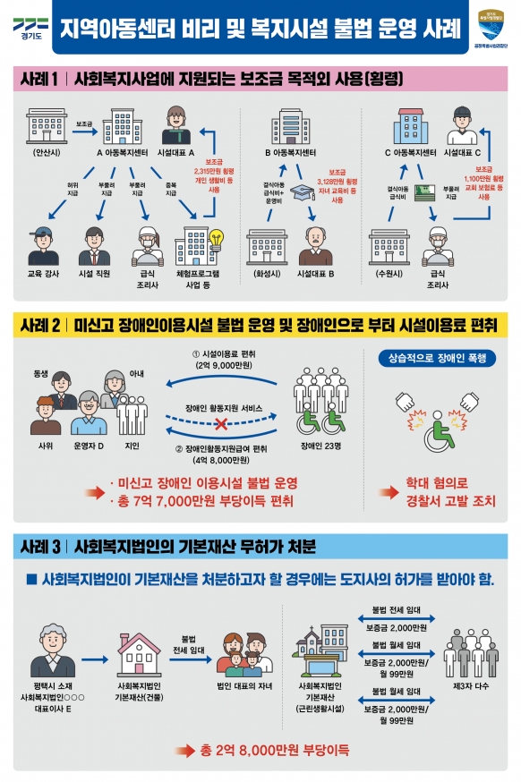 결식아동 급식비 등 보조금 수천만 원을 빼돌려 자녀 교육비로 쓴 지역아동센터 시설장, 장애인복지시설을 신고 없이 운영하면서 장애인들에게 수년간 이용료만 받아 챙긴 운영자 등 불법행위를 저지른 시설장 및 법인대표 6명이 경기도 공정특별사법경찰단 수사에 적발됐다.