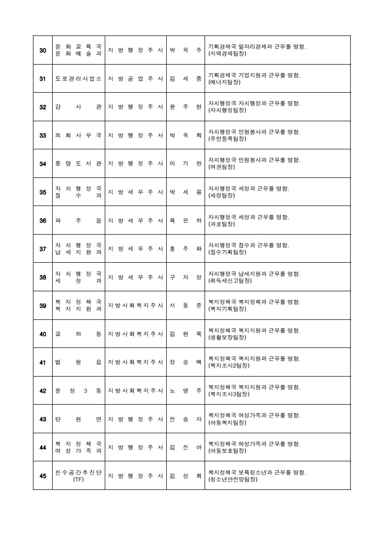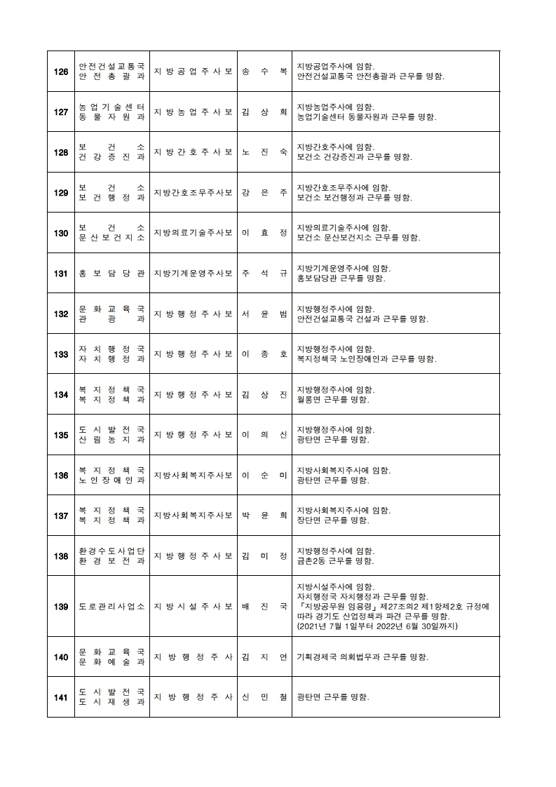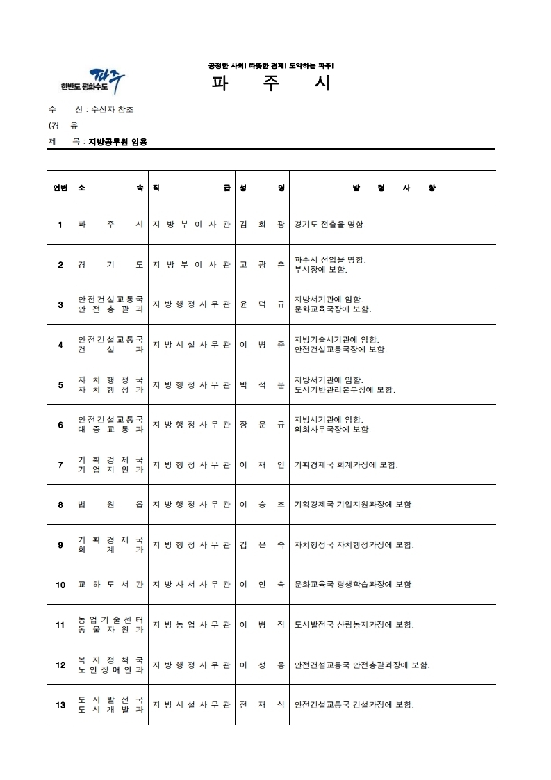 파주시, 2021년 하반기 정기인사 단행 - 도시관리본부 신설 및 조직개편 등에 따른 인사