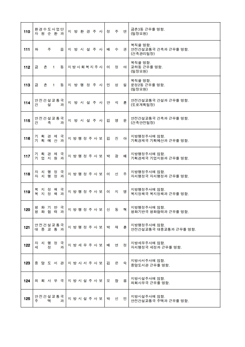 이번 정기인사는 4급 서기관 사무관 승진의결 4명을 비롯해 총 120명의 승진인사와 더불어 전보 257명, 신규공무원 임용 16명 등 총 393명의 규모로 이뤄졌다.