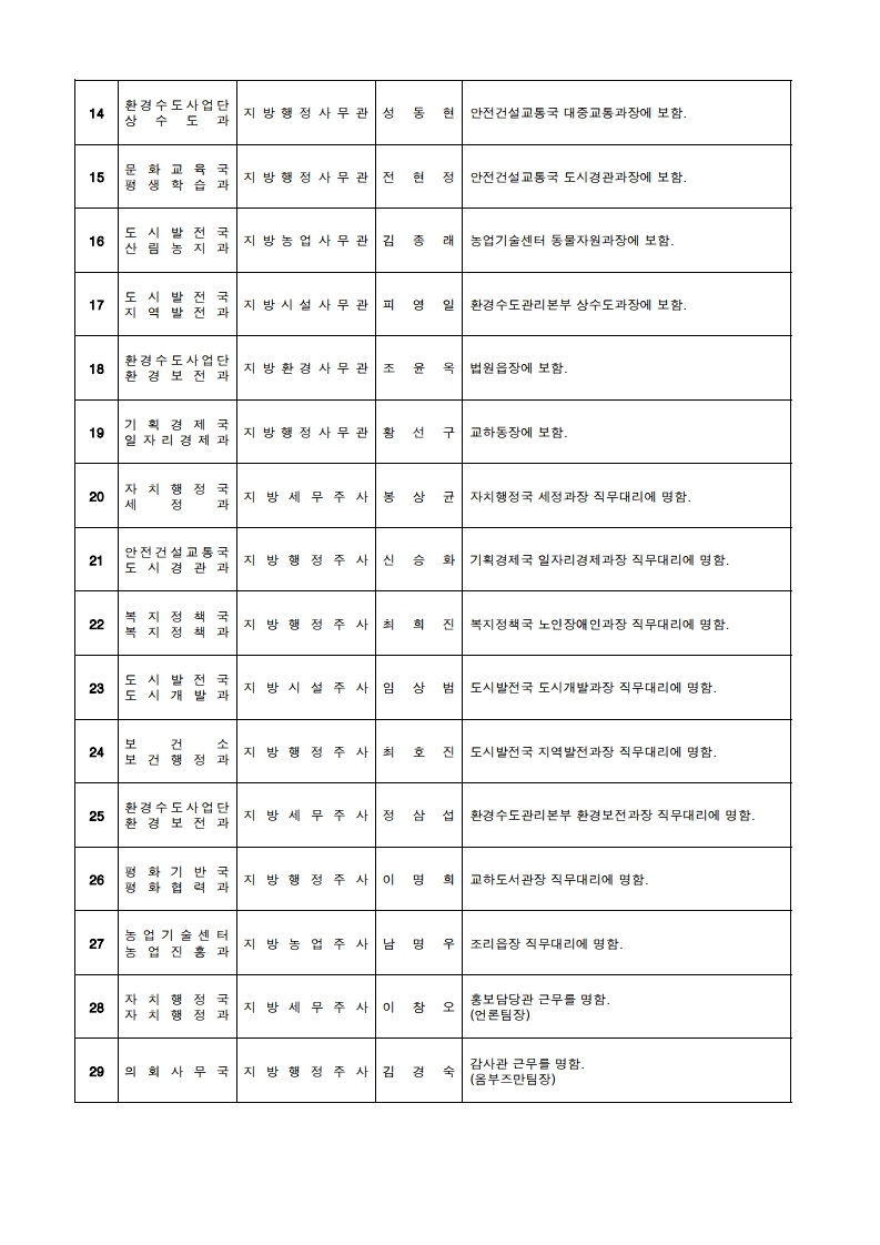 - 도시관리본부 신설 및 조직개편 등에 따른 인사