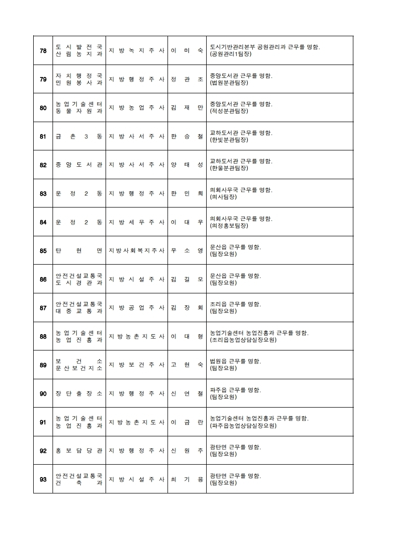 5급 승진인사로는 ▲일자리경제과장 직무대리에 신승화 광고물계획팀장 ▲세정과장 직무대리에 봉상균 세무팀장 ▲노인장애인과장 직무대리에 최희진 복지기획팀장 ▲도시개발과장 직무대리에 임상범 도시상임기획팀장 ▲지역발전과장 직무대리에 최호진 보건행정팀장 ▲환경보전과장 직무대리에 정삼섭 환경지도팀장 ▲교하도서관장 직무대리에 이명희 남북협력팀장 ▲조리읍장 직무대리에 남명우 농업진흥팀장이 임명됐다.