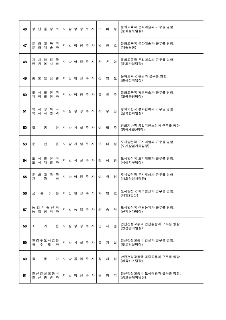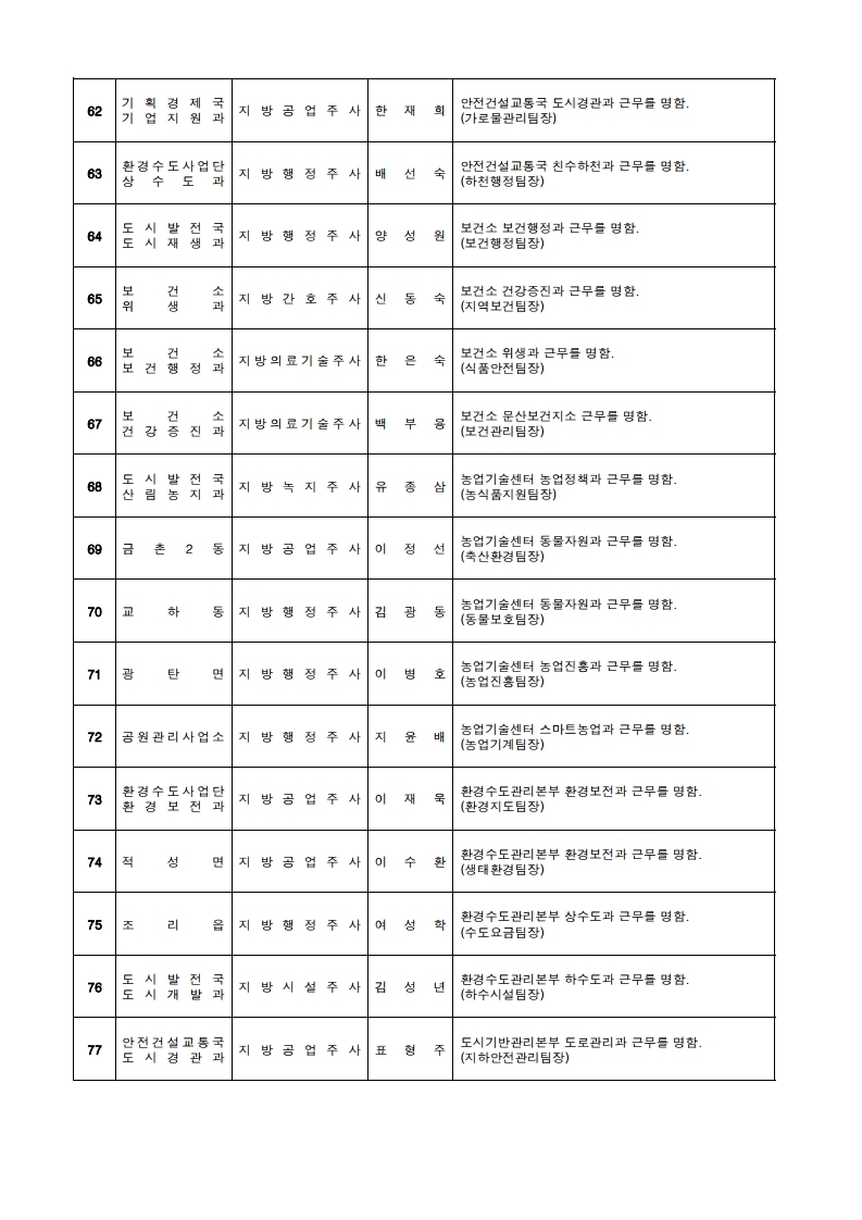 4급 승진인사로는 ▲문화교육국장으로 윤덕규 안전총괄과장 ▲안전건설교통국장으로 이병준 건설과장 ▲도시기반관리본부장으로 박석문 자치행정과장 ▲의회사무국장으로 장문규 대중교통과장이 임명됐다.