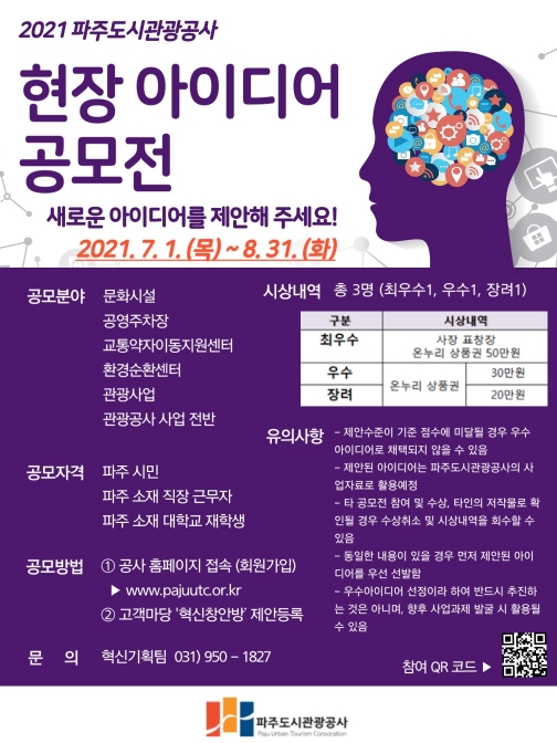 파주도시관광공사(사장 손혁재, 이하 공사)는 오는 7월 1일부터 8월 31일까지 ‘2021 현장 아이디어 공모전’을 개최한다고 밝혔다.